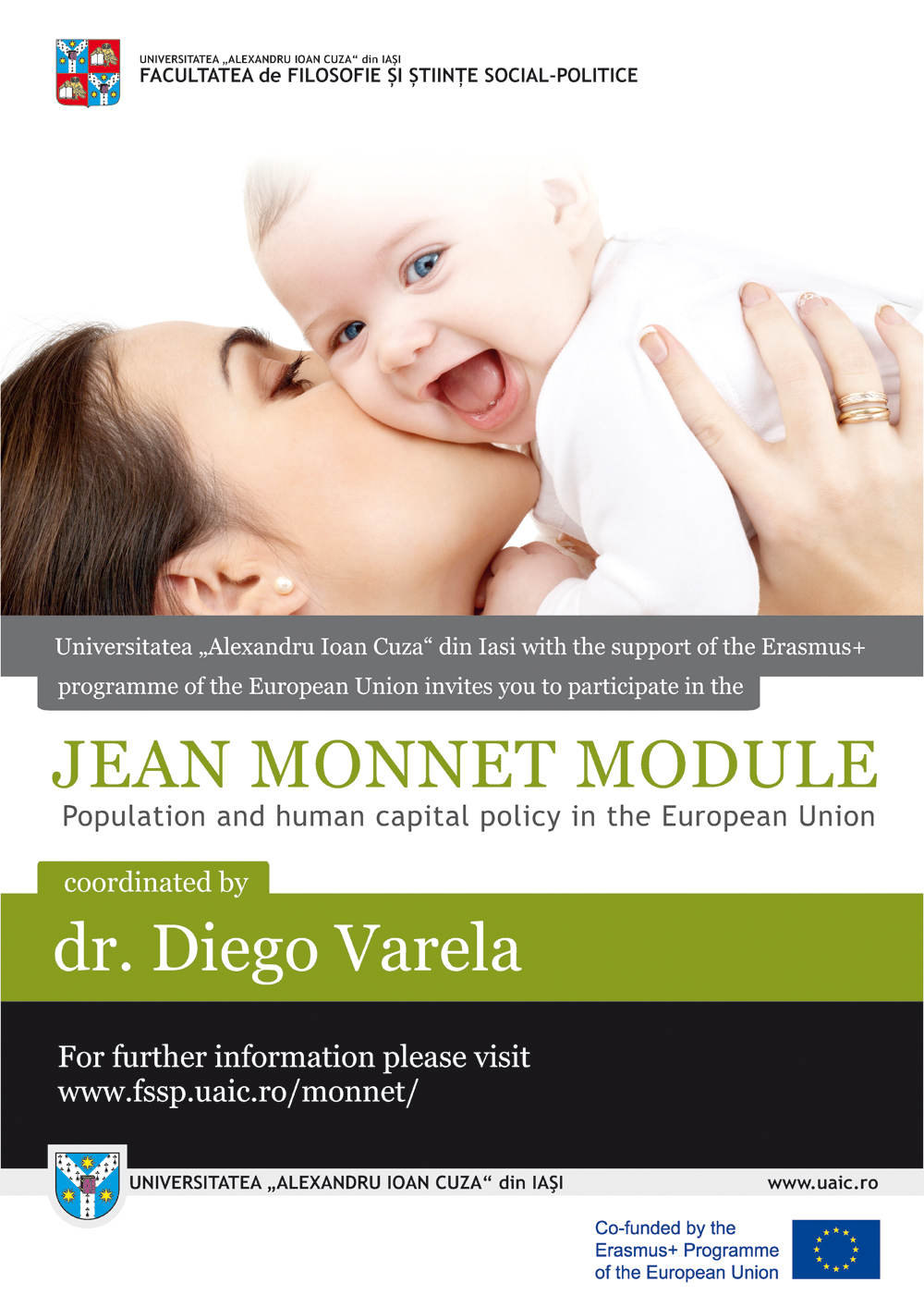 The teaching of the Jean Monnet module on population and human capital policy in the EU starts on Monday 13 October from 16.00 to 20.00 in room D2 of the Alexandru Ioan Cuza University of Iasi with a series of lectures on Population Policy in the EU.